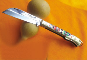 我們有幸在這街上見到了“塔石罕”的徒弟羅赫曼·芒蘇爾,他的小刀注冊了商標并在自治區獲過獎。在他的貨架上,我們見到了幾乎包括了各種類型的沙雅小刀,長度從15厘米到3厘米,五顏六色,令人眼花繚亂。如今小刀的制作技藝比過去有了進一步的提高,有的柄部還鑲嵌了銅、銀、牦牛、鹿角、山羊角、駱駝骨、玻璃鋼、寶石和有色塑料等,圖案更加豐富,做工更加講究。今年38歲的羅赫曼·芒蘇爾11歲開始學藝,他善于經營,如今有了小汽車,一個電話,就可以把小刀送到客戶的手里。