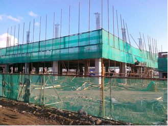 食堂為框架結構二層,一層柱、梁、板施工完畢,二層框架柱鋼筋已綁扎完畢。