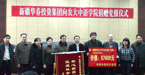 在2008年開啟之際的1月2日,新疆華春投資集團有限公司為了支持新疆農業大學中國語言學院的老師與同學們,方便及時學習黨的路線、方針、政策,從而及時了解國內外各項重大信息,因此新疆華春投資集團出資現金57600元訂購2008年全年的《新疆經濟報》200份,贈送給新疆農業大學中國語言學院,為新疆雙語人才的培育、為新疆和諧社會的構建,奉獻出新疆華春投資集團的一片愛心。