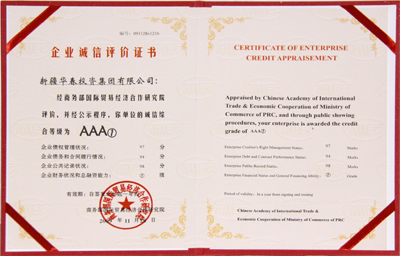 華春投資集團(tuán)被評為最高信用等級即AAA①級的誠信企業(yè),頒發(fā)了信用等級證書,并出具了信用等級評估報(bào)告。同時(shí),華春投資集團(tuán)被商務(wù)部研究院信用評級與認(rèn)證中心定為中國企業(yè)信用建設(shè)促進(jìn)聯(lián)盟發(fā)起單位,總裁李成功先生被定為中國企業(yè)信用建設(shè)促進(jìn)聯(lián)盟發(fā)起個(gè)人。