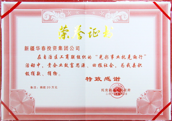 自治區黨委常委肖開提•依明、自治區政協副主席、自治區工商聯主席熱孜萬•艾拜、自治區統戰部副部長、自治區工商聯書記萬水等領導,帶領80多家區內民營企業家和異地商會,向托克遜縣捐助資金共計509.2萬元、捐贈物品價值131.9萬元。新疆華春投資集團捐助現金20萬元,為當地各族群眾奉獻愛心。華春集團總裁助理李榮桂、工會主席高青代表董事局主席兼總裁李成功先生,參加了捐贈活動。
