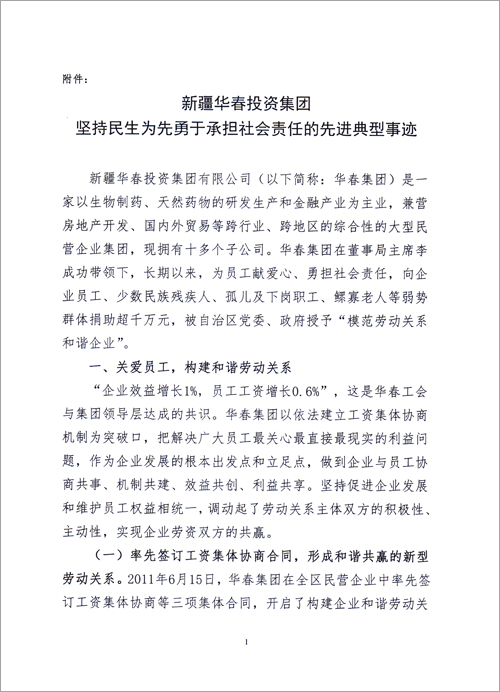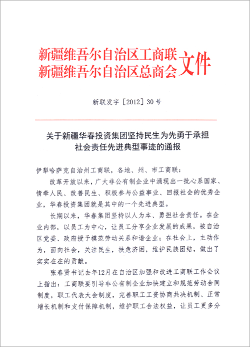 為引導(dǎo)全疆非公有制企業(yè)自覺履行社會責(zé)任,在保障和改善民生的實踐中發(fā)揮積極的作用,為政府分憂,為群眾解困。自治區(qū)工商聯(lián)(總商會)決定將華春投資集團(tuán)堅持民生為先勇于承擔(dān)社會責(zé)任先進(jìn)典型事跡通報全區(qū)工商聯(lián)。號召廣大非公有制企業(yè)和非公有制經(jīng)濟(jì)人士向華春投資集團(tuán)學(xué)習(xí),自覺承擔(dān)社會責(zé)任,為保障和改善民生,為新疆的跨越式發(fā)展和長治久安做出應(yīng)有的貢獻(xiàn),以實際行動迎接黨的十八大召開。