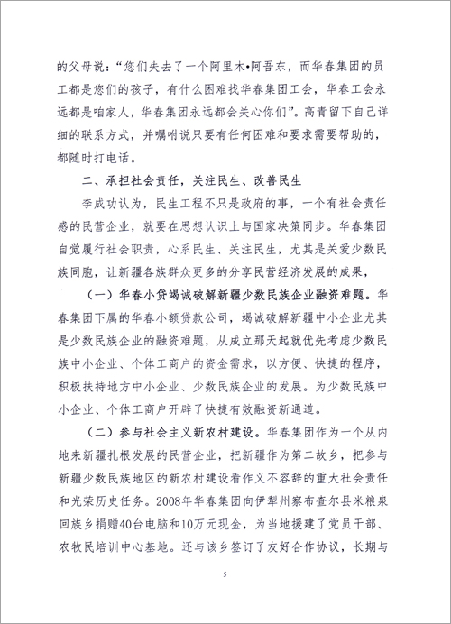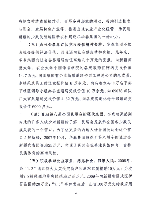 華春投資集團(tuán)的決策者李成功總裁認(rèn)為,民生工程不只是政府的事,非公企業(yè)要自覺履行社會職責(zé),關(guān)注民生,心系民生,全力改善民生。李成功總裁在思想認(rèn)識上與國家決策同步,不但讓企業(yè)員工分享企業(yè)發(fā)展的成果,而且讓新疆各族群眾分享非公經(jīng)濟(jì)發(fā)展的成果,這已成為華春投資集團(tuán)的常態(tài)。
