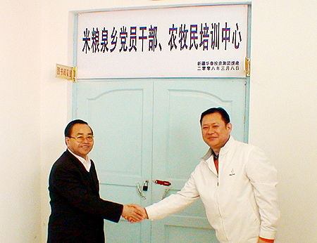 自治區(qū)黨委副秘書(shū)長(zhǎng)農(nóng)辦主任代寧祥和新疆華春投資集團(tuán)董事局主席兼總裁李成功先生為米糧泉鄉(xiāng)黨員干部農(nóng)牧民培訓(xùn)基地揭牌
