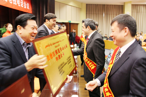 自治區(qū)領(lǐng)導(dǎo)為新疆華春集團(tuán)頒發(fā)“自治區(qū)模范勞動(dòng)關(guān)系和諧企業(yè)”獎(jiǎng)牌