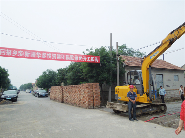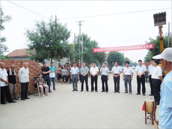 6月19日,風和日麗,晴空萬里,華春集團總裁李成功先生捐款200萬元修路開工儀式在壽光市雙城生態園區南木橋村舉行。李總裁的母親大人、三弟李榮獻、總助李榮貴、集團審計部副部長沈其明及壽光市政法委、公積金中心、雙城生態園區等領導和部分村民代表約50余人參加了捐款修路儀式。